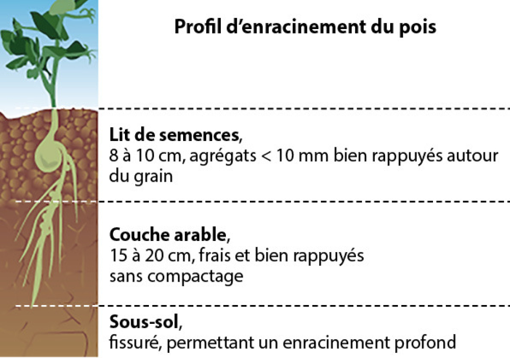 Le pois et la féverole, comme toute légumineuse, sont sensibles aux compactions, limitant leur enracinement et la mise en place des nodosités. Il est recommandé d'assurer une bonne structure sur minimum 15-20 cm, zone où s'opère l'essentiel de l'exploration des radicelles et de la mise en place des nodosités. Pour assurer l'autonomie azotée de la légumineuse, la symbiose nécessite un sol aéré pour capter l'azote de l'air présent dans ce 1er horizon du sol. En conséquence, vigilance pour les sols à risque de compaction et/ou d'anoxie, tels que les sols séchants, les argiles lourdes et les limons battants et hydromorphes pouvant entraver l'alimentation des pois et féveroles.