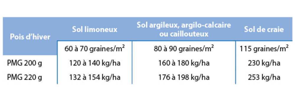Le pois et la féverole d'hiver ramifiant (2-3 tiges/plante), il est conseillé de ne pas dépasser les densités recommandées, au risque de développer des couverts trop denses favorisant les maladies telles que la bactériose pour le pois, ou l'ascochytose pour le pois ou le botrytis pour la féverole. De plus, la surdensité augmente inutilement la charge en semences pour un risque de perte de potentiel plus grand.