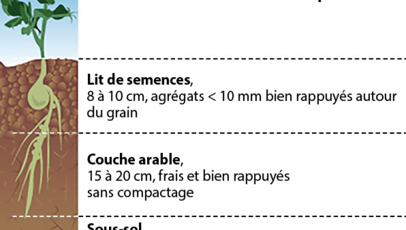 La préparation du lit de semence doit également être soignée sur 8-10 cm, afin de permettre d'enterrer à une bonne profondeur les graines et d'améliorer le contact sol-graine. Le pois d'hiver demande un lit de semence fin (agrégats < 10 mm). À l'inverse la féverole peut s'accommoder d'une préparation plus grossière (agrégats de 2-3 cm). En cas de risque de battance, n'hésitez pas à laisser quelques mottes de 5-6 cm pour limiter le risque de croûte debattance.