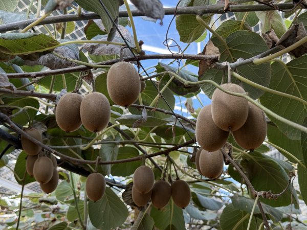 La culture des kiwis sous les serres est conduite en pergola contrairement à ceux en plein champ, cultivés en T-bar.