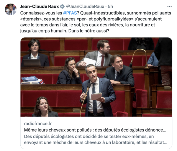 "Aux États-Unis, cela fait un quart de siècle que le sujet est sur la table. En France, on en est encore à s'arracher les cheveux pour qu'il ne soit pas escamoté", commente Nicolas Thierry, député de la Gironde à l'origine de l'initiative, comme le rapporte Le Monde. Avec des confrères, ils ont fait analyser leurs mèches de cheveux révélant du mercure, des pesticides, des plastifiants, mais aussi des "terres rares", ces métaux utilisés notamment dans les smartphones, écrans d'ordinateurs portables... "Cela interroge les modes de production et de consommation de notre société, qui créent finalement des nouvelles maladies", alerte Yann Chantrel, représentant les Français établis hors de France, dans Geo. "Ces substances sont à la fois indestructibles et très mobiles dans l'environnement. Une étude l'a montré très récemment, vous avez des PFAS, substances perfluoroalkylées, dans le sang des ours polaires", illustre Nicolas Thierry, comme le relate Radio France.