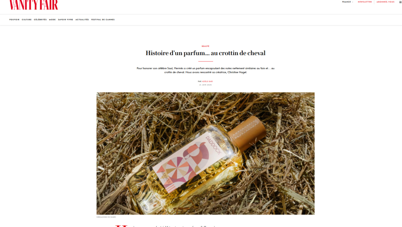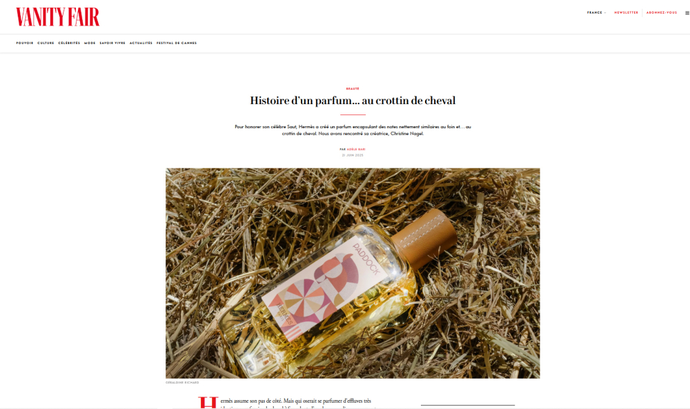 Chez Hermès, on connaissait les célèbres carrés de soie, le pendentif chaîne d'ancre iconique ou bien encore son sac Kelly en hommage à la princesse de Monaco. Il faudra désormais compter avec un nouveau parfum, plus... étable et crottins. Christine Nagel - directrice de la création et du patrimoine olfactif d'Hermès Parfums depuis 2016 - murmurait à l'oreille des chevaux, ou plutôt d'un cheval de la Maison en particulier, à savoir Hermès Ryan, quand elle a souhaité reconstituer le fumet qu'elle ressentait en sa présence. Après cinq ans de travail nécessaires à caractériser cette fragrance complexe, la part des anges - ou plutôt du dieu grec antique dont l'animal totem était le cheval - présente des effluves mêlant paille et foin, orge et avoine, musc de bois, cuir et cire, mais aussi huile de cade, dont on enduit les sabots. Ce parfum qui cherche encore son nom, entre 'Paddock' et 'Crottin délicieux', sera sans nul doute apprécié des cavalières et cavaliers, concourant ou non pour le Grand Prix du Saut Hermès, sous la belle voûte du Grand Palais, rappellent nos confrères de Vanity Fair. Comme quoi, cheval vaut plus que richesse...