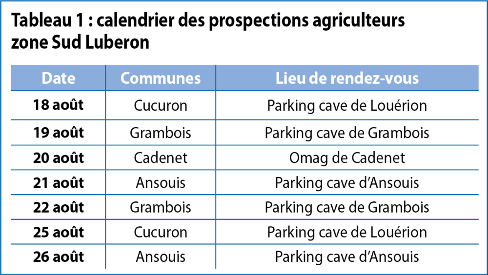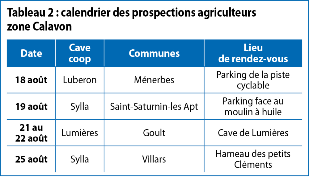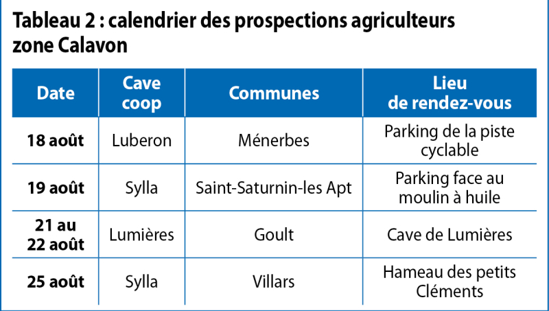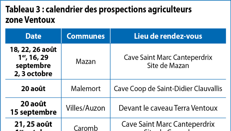 Concernant les autres communes, le calendrier des prospections organisées par la Chambre d'agriculture à la demande de l'ODG du Ventoux est synthétisé dans le tableau 3. Les prospections auront lieu sur des demi-journées de 7 h à 12 h à partir du 18 août ; et de 7 h 30 à 12 h 30 à partir du 25 septembre. Pour y participer rapprochez-vous de votre cave coopérative ou contacter Jean-Marc Long : 06 26 35 95 18, jean-marc.long@vaucluse.chambagri.