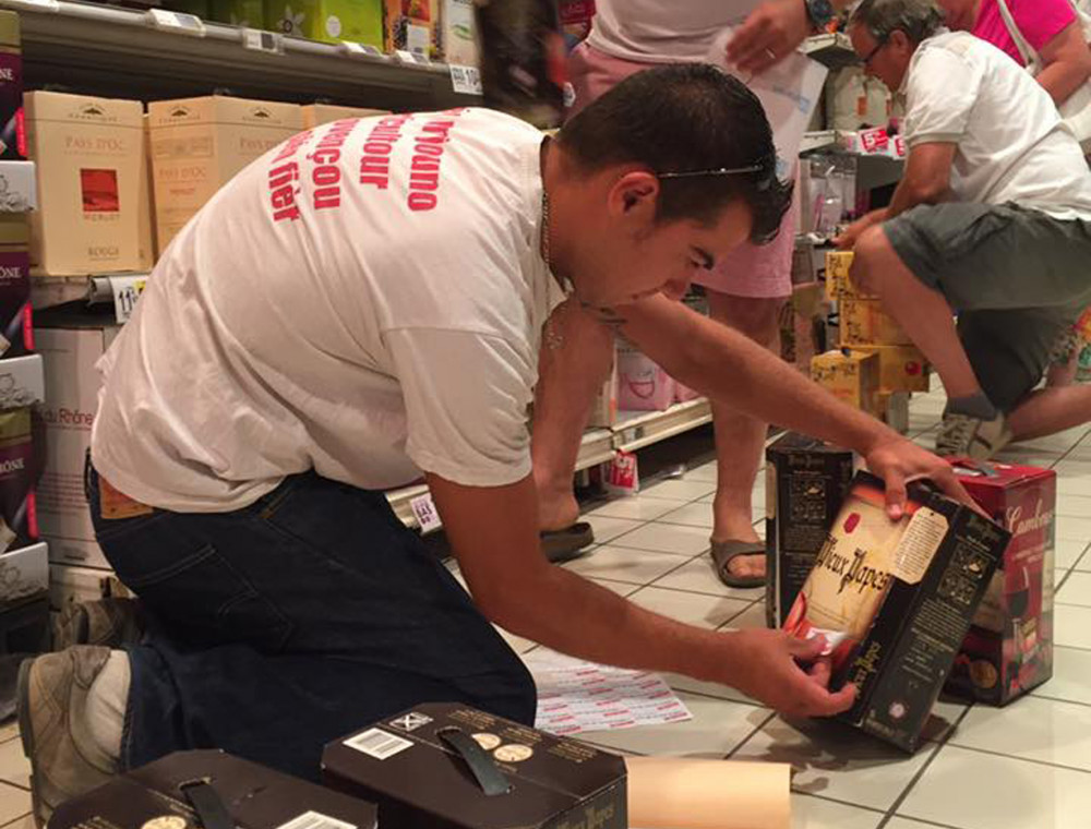 Dans un objectif pédagogique, les responsables agricoles ont étiquetés « vin de nulle part » les BIB et bouteilles sans origines précises afin d’informer les consommateurs, mais sous le regard très désapprobateur du responsable du magasin Leclerc de Morières qui n’a pas du tout compris l’intérêt de la démarche.