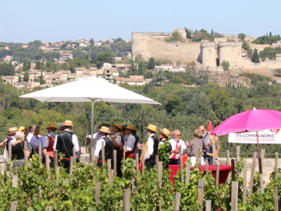 C’est en comité restreint, mais avec la même solennité et la même convivialité, que le ban des vendanges a été proclamé masqué par les Compagnons des Côtes du Rhône, s...